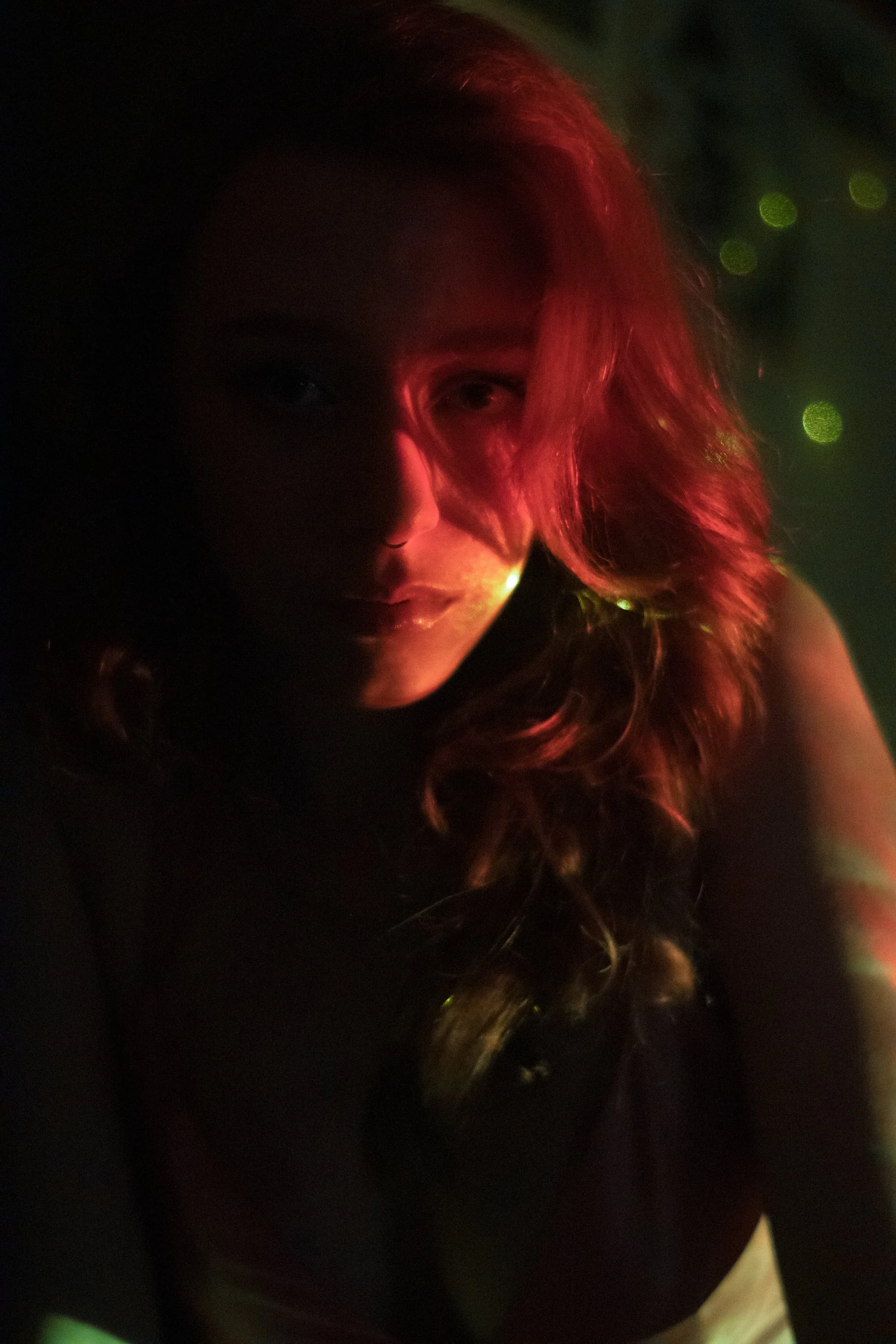 A woman with curly hair and a nose ring partially illuminated by red and green lighting in a dark setting.