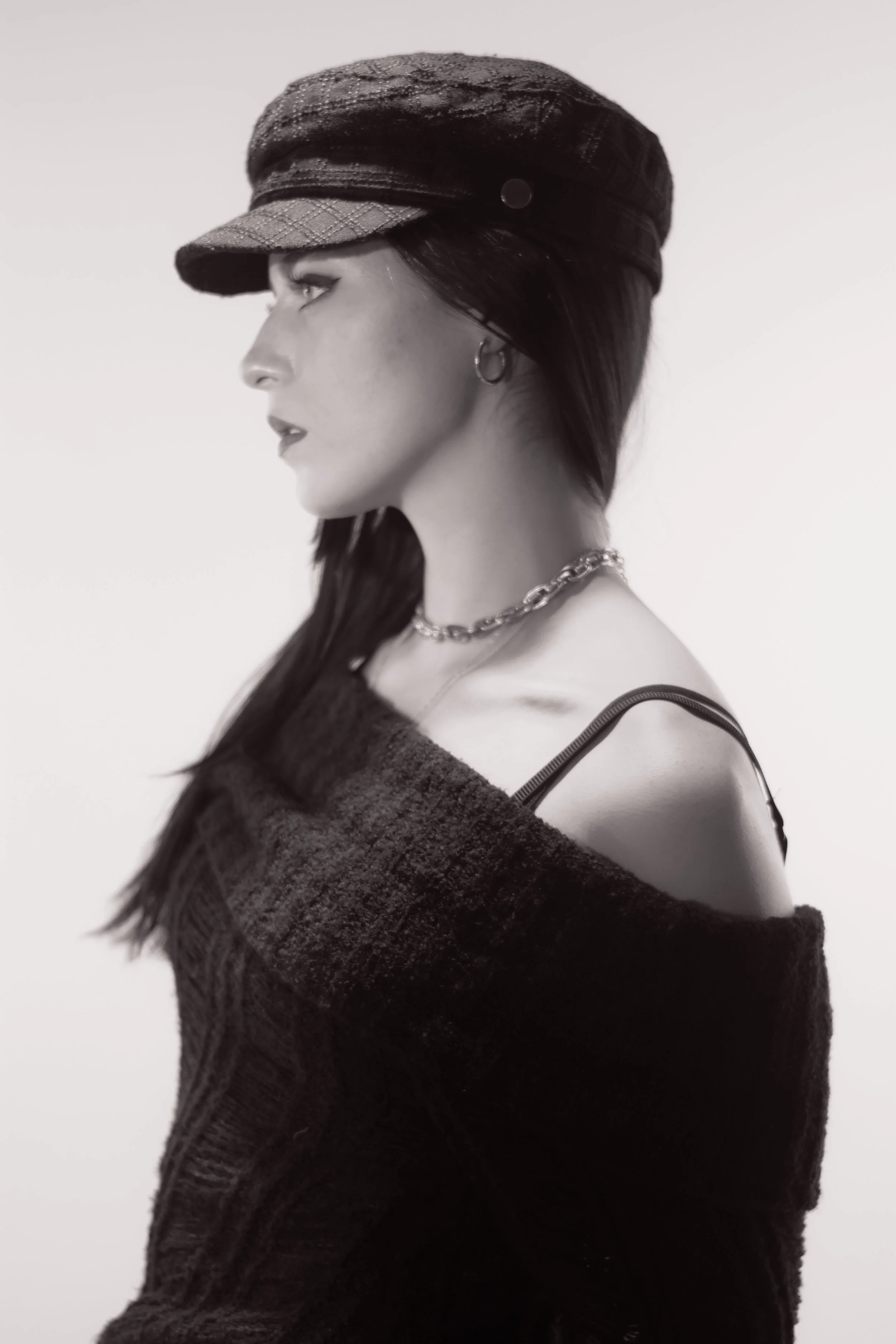 A black and white portrait of a woman with long dark hair, wearing a dark cap, a chunky knit sweater off one shoulder, a visible strap, hoop earring, chain necklace, and looking to the left.