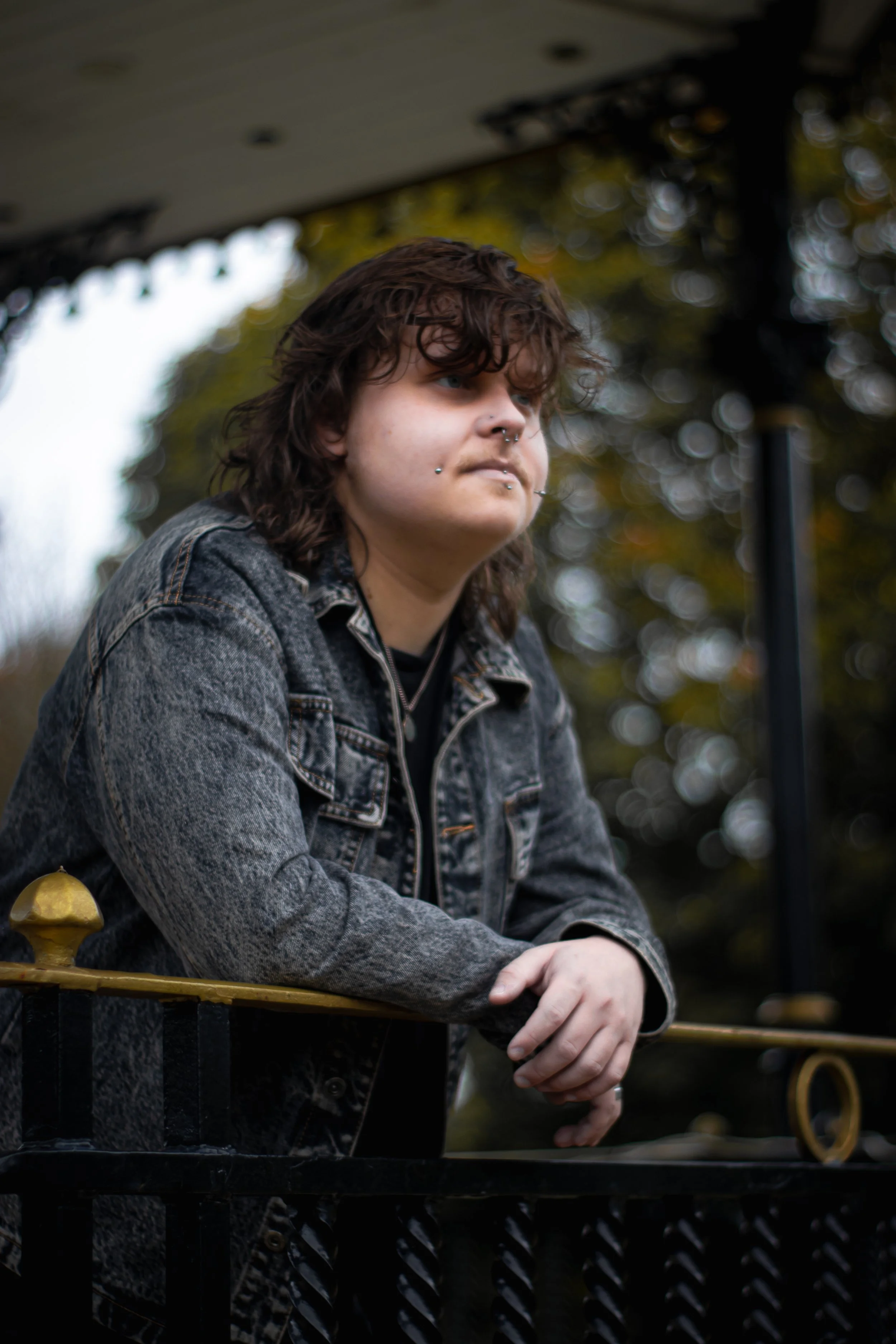 A young person with long, wavy brown hair, multiple facial piercings, and a dark denim jacket, leaning on a black and gold metal fence outdoors with blurred trees in the background.