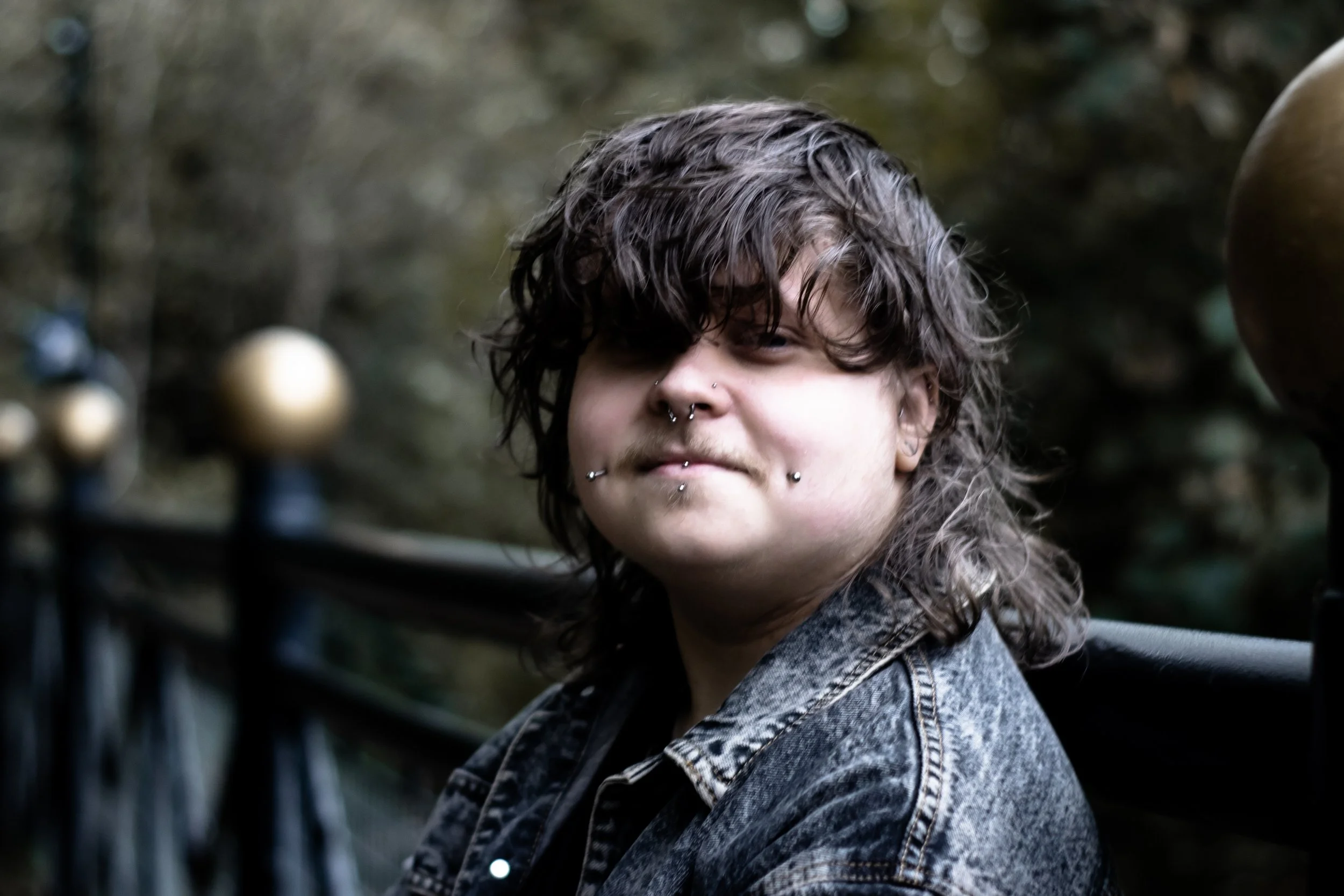 Person with shoulder-length curly hair, multiple facial piercings, and a nose ring, wearing a black shirt and denim jacket, sitting outdoors near a metal railing with a blurred natural background.