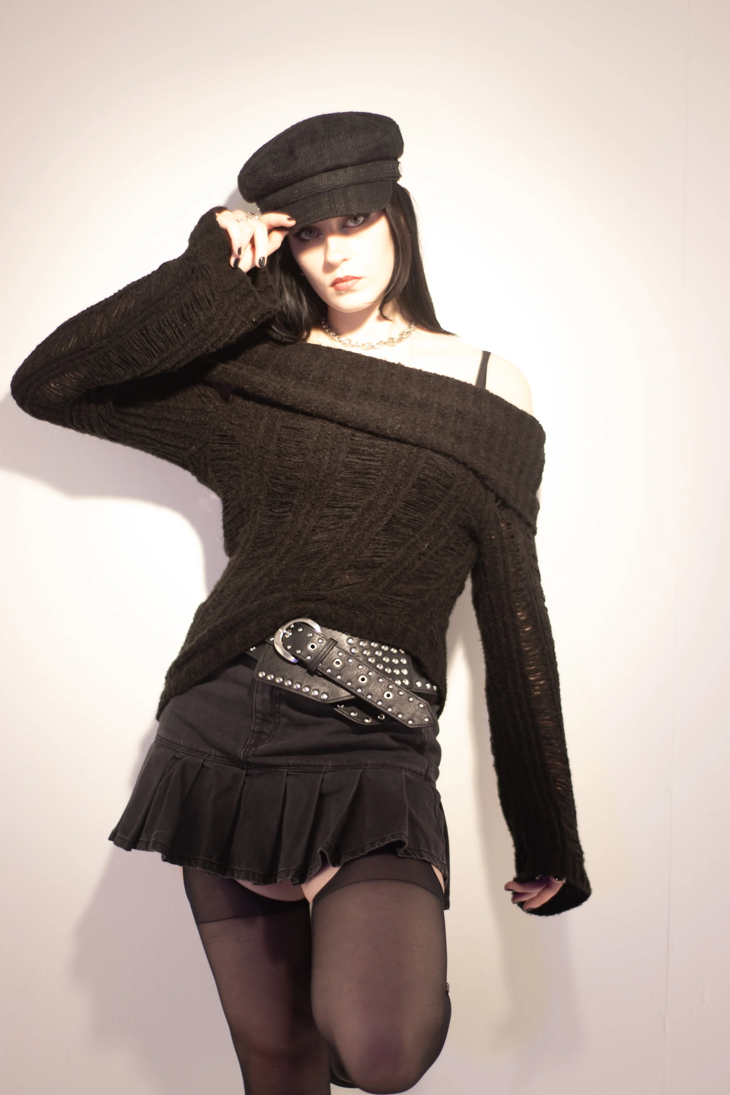 Young woman with dark hair and fair skin wearing a black hat, off-shoulder black sweater, black pleated mini skirt, black stockings, and a studded belt, posing against a plain white background.