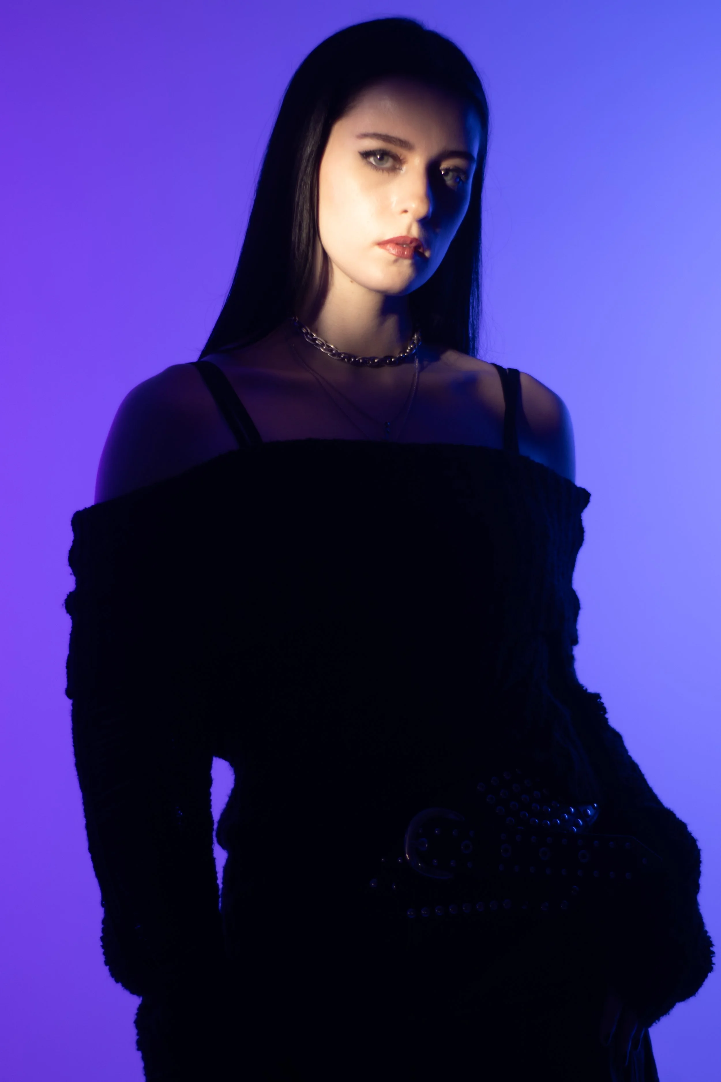 A young woman with long dark hair and pale skin posing against a purple background, wearing a black off-shoulder top, layered necklaces, and a studded belt, with dramatic makeup and a serious expression.